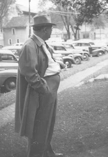 The hair styles look like the forties to me. Maybe a war bride; one of the many couples who rushed through weddings when death in combat was a real possibility. My guess is that the bride is throwing the bouquet, even though it can't be seen in this photo. The scanning of these old photos require a minuscule cropping on the edges of the image. I've lost just enough that the top of the bulletin board in the background was lost. In the original it reads, "Ridgewood Lodge, No. 1455." A quick Google search came up with Elks Lodge 1455, Ridgewood, New Jersey.